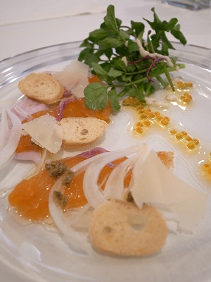 信州サーモンのカルパッチョです。鱒の卵やエシャロットを使ったソースでいただきます。