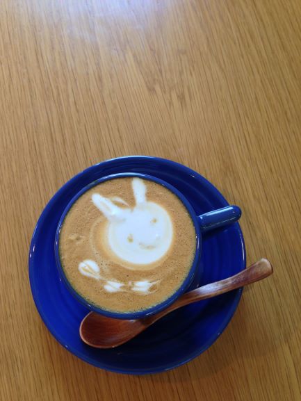 彼女の食後はカプチ―ノ。ウサギの形が描かれていたので、目と口を描いてかわいらしく!