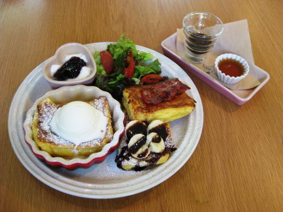 私は、フレンチトーストプレートを注文。浅野屋のパンを使ったフレンチトーストは、外はカリカリ中はフワフワ。3種類の味を楽しめます。ベーコン添えには、メープルシロップをかけて、バニラアイスにはエスプレッソをかけてアフォガード風に。そして、バナナとチョコソーストッピング。ボリューム満点で、お腹いっぱい。
