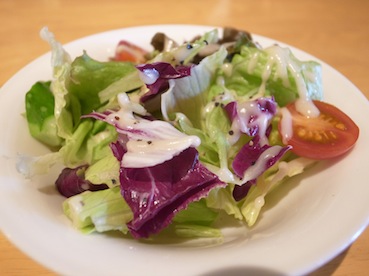 サラダは新鮮なレタス、ミニトマト、キュウリの上にフレンチドレッシングがかかっています。