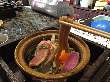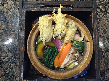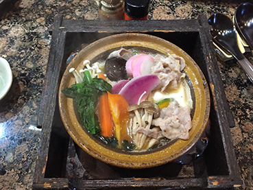寒くなり始めたこの時期は、鍋焼きうどんがぴったりですね。初めは黒うどんが見えないほど、野菜やきのこの具材がたっぷりでした。熱々のたくさんの具材と、黒うどんを食べて体の芯から温まりました。