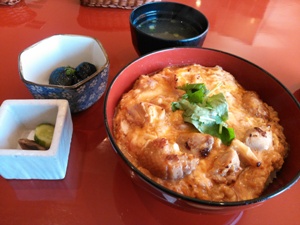 ぎたろう軍鶏の親子 1200円(鶏スープ、小鉢、漬物付)