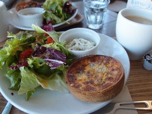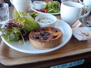 本日のデリにグリーンサラダ、メインのキッシュにドリンクが付くセットです。ショーケースに並んだ6種類のキッシュから、好きなものをひとつ選べます。この日のデリメニューは、大根をハーブとマヨネーズで和えた、レムラードというサラダでした。