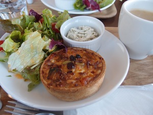 「ジャーマンパンプキンキッシュ」は、荒く崩したたっぷりのカボチャに、ベーコン、玉ねぎがジャーマンポテト風に仕上げてあります。フワッとしたキッシュ生地の上には、レーズン、カボチャの種、松の実がのっていて、味のアクセントになっていました。