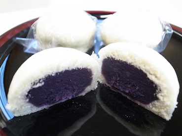 立科産の紫芋から作ったあんこを薄皮で包んだお饅頭。二つに割ると鮮やかな紫色のあんが顔を出します。なんとも素朴な味わいです。