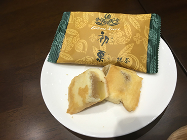カステラ風の生地に栗あんと栗の甘露煮を包んだやさしい味で、コーヒーとの相性もぴったり。宇治抹茶の生地にこしあんと栗が入った抹茶味とセットにして、お土産に持ち帰りました。