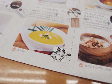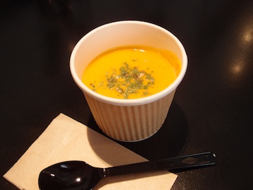 新鮮な野菜やオリジナルの食品などが並ぶ「ココペリ」では、「ひだまり」をイメージした鮮やかな黄色のポタージュをテイクアウトしました。お砂糖を使用せず仕上げてありますが、自家農園で収穫した「バターナッツかぼちゃ」の甘みが口に広がる優しい味わい。自家製パセリとかぼちゃの種が味をひきしめます。