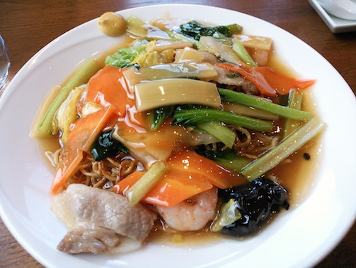 担々麺と人気を二分する五目あんかけ焼きそばは、エビや筍、人参などが入って具だくさん。「やわらか麺ですが、所々パリッと焼いてあって食感が楽しい」とのこと。