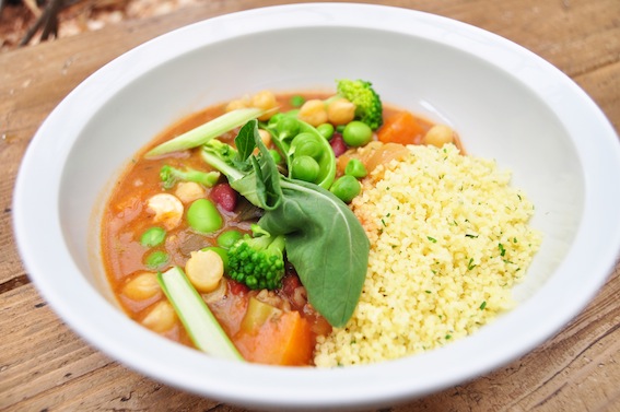 クスクスは北アフリカや中東、ブラジルなどではポピュラーな小麦から作る粉状のパスタ。ブロッコリーに人参、ひよこ豆に菜の花と野菜たっぷりで、スープがクスクスによく染み込みます。このつぶつぶ食感はクセになりそうです。