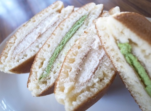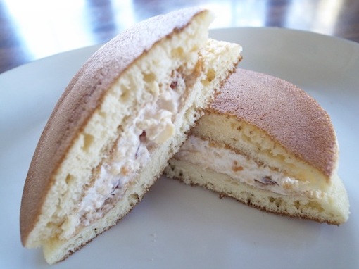 生クリームを使った「生どら焼き」は様々な味がありますが、カマンベールチーズとまっ茶(ともに180円)を選択。ふわっとした生地がまろやかなクリームを挟んでいます。夏は、持ち帰り用の冷凍タイプの溶けかけを味わうのも、個人的にオススメです。