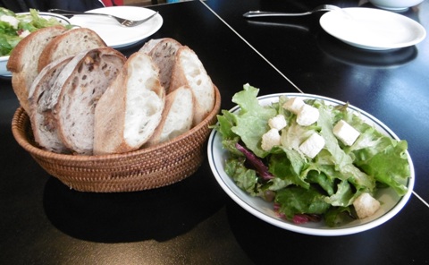 ランチを注文すると、バゲットやクルミパンなど3種類のパンとクルトンののったグリーンサラダが付いてきます。