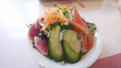 小さめのお皿ですが、山のように盛られた新鮮な野菜のサラダ。