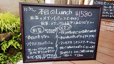 入口の黒板メニューをチェック。おすすめの人の話では、お料理は