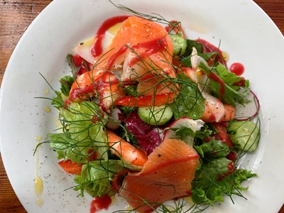 小エビ、ホタテ貝、マリネサーモンのサラダ 木いちごのドレッシング
