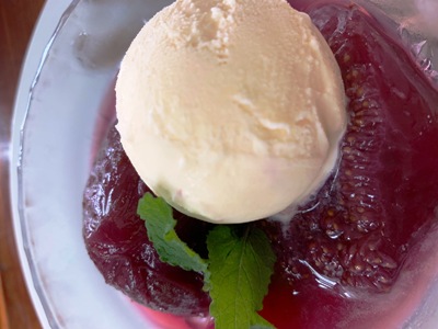 ワインの味が効いたイチジクに、バニラアイスの溶けたところが美味。