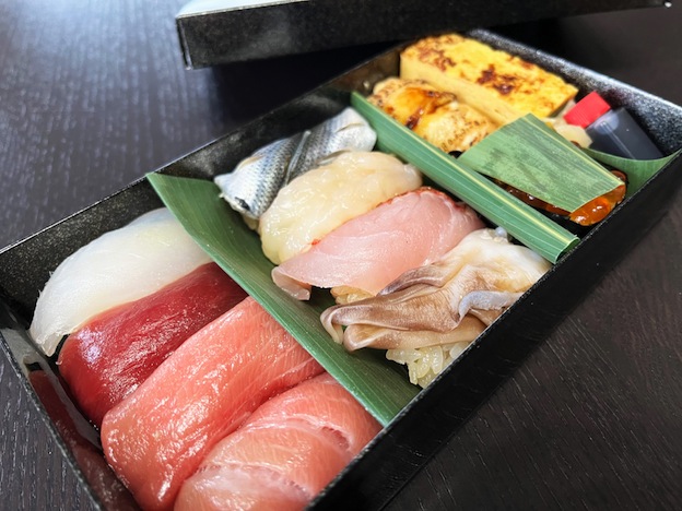 蓋をあけた瞬間、彩り鮮やかな具材が目に飛び込んできます。この日の具材は、本鮪の中トロ、赤身、コハダ、信州サーモン、金目鯛、やがら、目灯烏賊、ホタテ、穴子、かに、いくら、厚焼玉子。