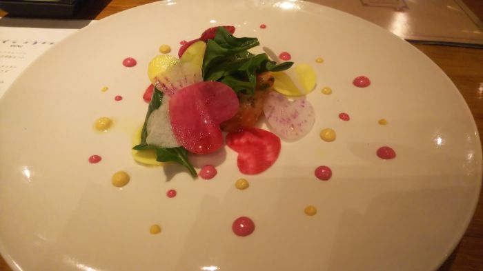 上にのった野菜は、紅芯大根やビーツなどの薄切りで