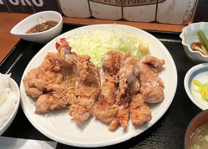 以前から私が好きでよく頼んでいるのは、もも肉まるまる1枚を豪快に揚げた鶏山賊焼き定食(1050円)。