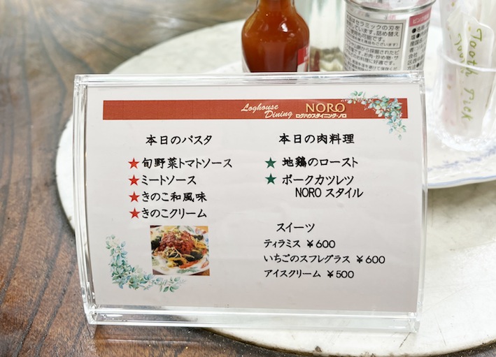 軽井沢との町境からもほど近い、御代田町の「ログハウスダイニングNORO」にランチへ。ちょっと前まで、ワンちゃんはテラス席オンリーでしたが、今は店内もOK。
