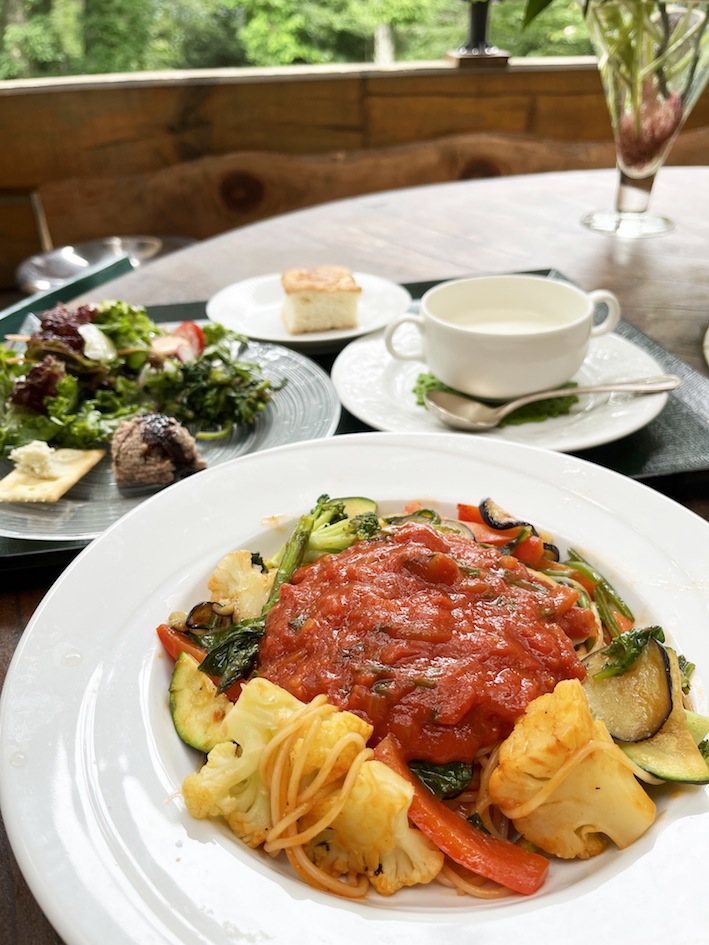 大きめにカットされたナスにパプリカ、ズッキーニ、カリフラワー、アスパラなどの野菜がたっぷり。トマトソースがよくからみ、ぱくぱく頂けます。お腹いっぱいで大満足の内容でした。