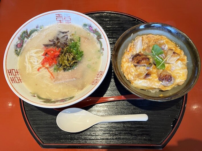 「長浜ラーメン ミニ親子丼セット 1,750円」を注文しました。ふっくら玉子にくるまった、ハリのある鶏の歯ごたえがたまりません。満足満足でした。長浜ラーメン単品だと990円です。