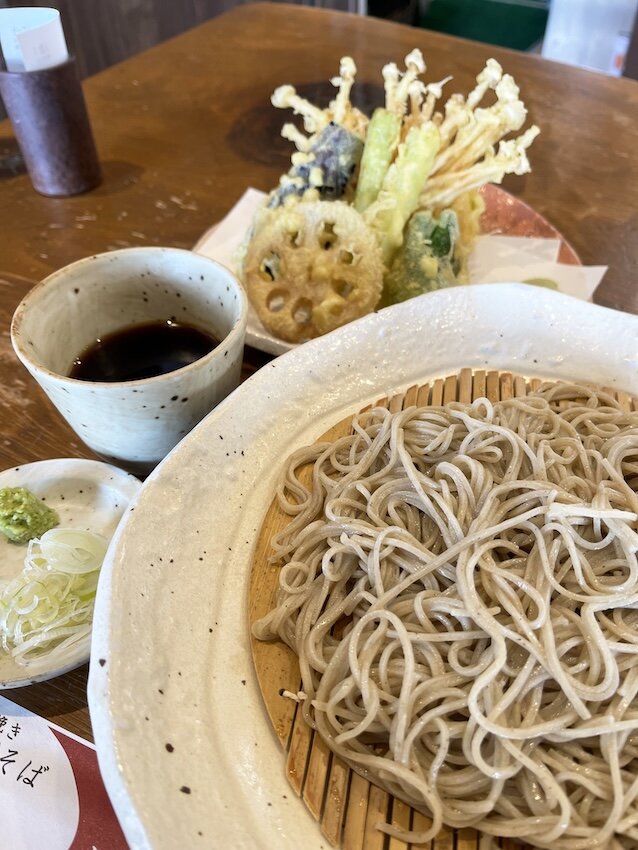 蕎麦は100%地元産で、冷えた極細の麺につゆがしっかりからみ、喉越しもgood!天ぷらはレンコンにアスパラ、ナス、ピーマン、えのき茸、カボチャ。抹茶塩をふりかけて、サクサクの食感と野菜の甘みを楽しみました。