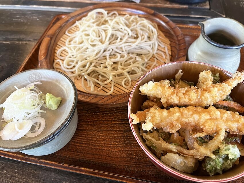 1月末、浅間サンライン普賢山落の交差点近くの「霧下そば地粉や」(御代田町)へ。お昼時でしたが、待たずに入れました。「野菜天ぷら蕎麦」(1,750円)を注文。