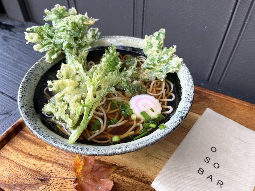 軽井沢コモングラウンズ内の「OSOBAR」では、「たまには温かいそばも!」と一番人気の「天ぷら春菊(温)」(900円)をいただきました。