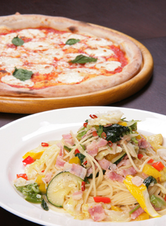 旬の野菜を贅沢に使ったペペロンチーノスパゲッティとピッツァマルゲリータ