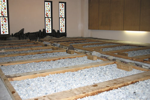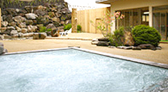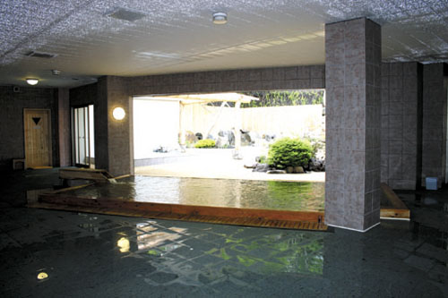 高原の牧場を楽しんだ後は、源泉かけ流しの檜風呂や開放感あふれる露天風呂でゆっくりと。天然石の敷かれた寝湯「せせらぎの湯」も人気。