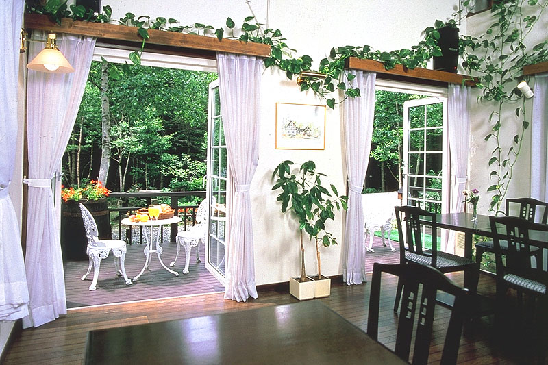 静かな森に暮らす野生のリスや小鳥たちが時折訪れる森の洋館。テラスでティータイムなどゆったりとした休息の時間が過ごせる。