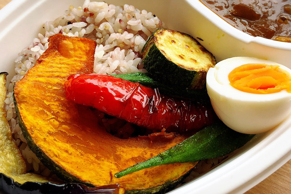 軽井沢の野菜と牛筋を煮込んだ大人カレーと竹皮で包んだおにぎり弁当。お惣菜やサラダのテイクアウトができます。ほっこりする家庭料理です。