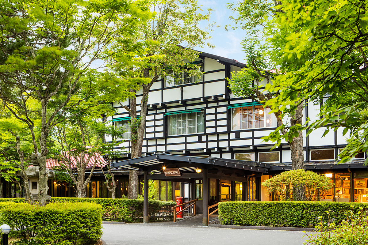 ホテルの前身である旅籠亀屋の主人・佐藤万平が、軽井沢を見出した二人の外国人宣教師を初めてもてなしたのは、明治19年のこと。以来、軽井沢を訪れる数々の著名人に愛され、多くの文人の作品にも登場してきた由緒あるホテル。猫足のバスタブ、軽井沢の過去と現在が描かれたステンドグラス、伝統的フレンチが供される重厚なダイニングルーム…昭和11年の建築当時の姿を今に残す旧きよきたたずまいは、訪れる人をつかの間、ロマンあふれるタイムスリップへといざなってくれる。