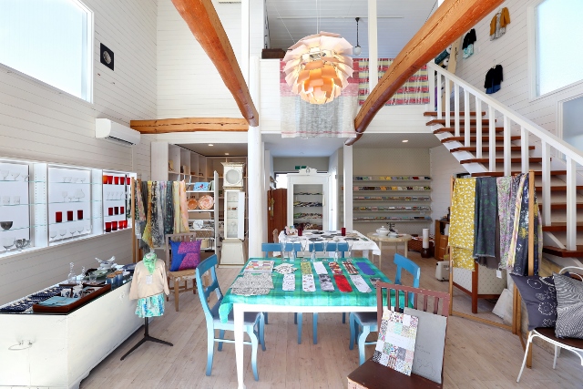 店内に並ぶ衣類や生活雑貨の柄は、隣接するアトリエで制作されたデザイン。