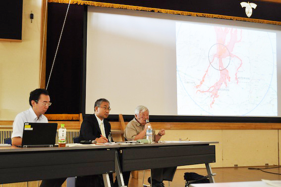 質問に答える荒牧重雄さん(右)。説明会には123人が参加。ハザードマップは町ホームページでも見られ