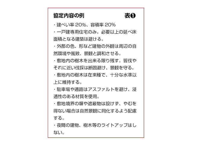 今後、該当エリアや近接地域で建設や開発等が行われる場合は、計画段階で協定委員会に諮り、協議することが求められる。