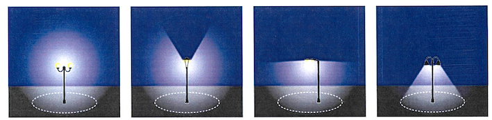 左から順に漏れ光が多い配光の例(環境省「光害対策ガイドライン」より)