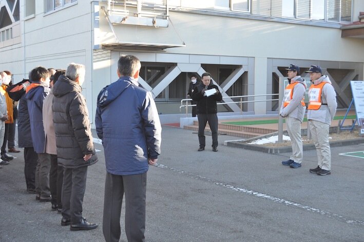 役場駐車場で1月26日朝、輪島市の避難所運営支援へ向かう町職員2人の出発式が行われた。