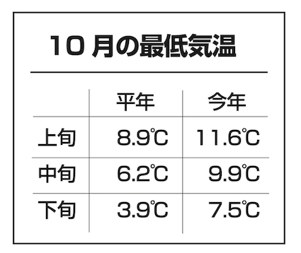 気象記録を見ると、7月から10月までの4カ月間は最低気温が平年より2〜3度高く、10月に入っても最低気温が平年ほど下がらない状態が続いていた。紅葉は最低気温が8度に下がると色づき始め、5度に下がると急速に進むと言われている。平年なら10月10日頃に8度を下回り、そのまま気温が徐々に下がり続け、20日頃には5度を下回る。しかし今年は、10月9日の最低気温は6度だったが、15日から最低気温が10度を超える暖かい日が続き、5度を下回ったのはわずか3日間だけだった。最低気温が下がらないことが、紅葉の異変に影響している可能性が高い。