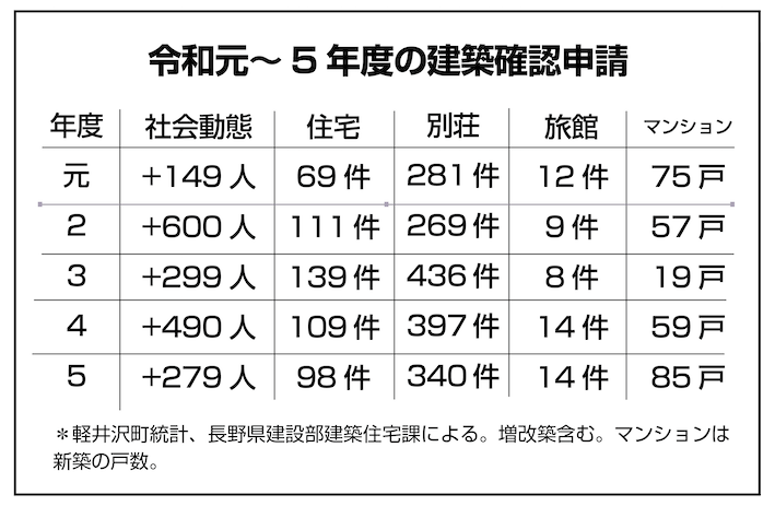 現在、軽井沢町内で建設中または計画中のマンションやホテルが15件あることが明らかとなった。町内の開発は、令和1〜5年の5年間で新築が2433件、内マンションは295戸、宿泊施設は57件に上る。増え続ける大型施設の建設による自然環境への影響を懸念する声が住民の間で高まっている。