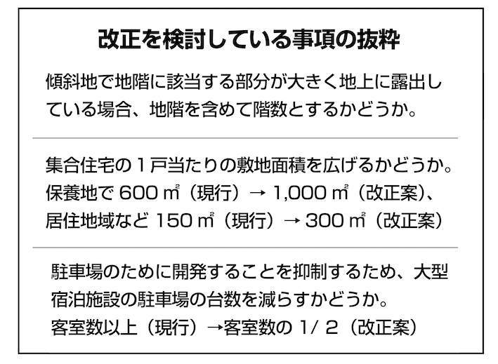 11月の部会では、「傾斜地の階層の基準」、「集合住宅の一戸あたりの敷地面積」、「大規模宿泊施設の駐車場台数」などの改正案が町から提示された。部会での検討や説明会・パブリックコメント等を経て、改正できるものは来年度から施行する。