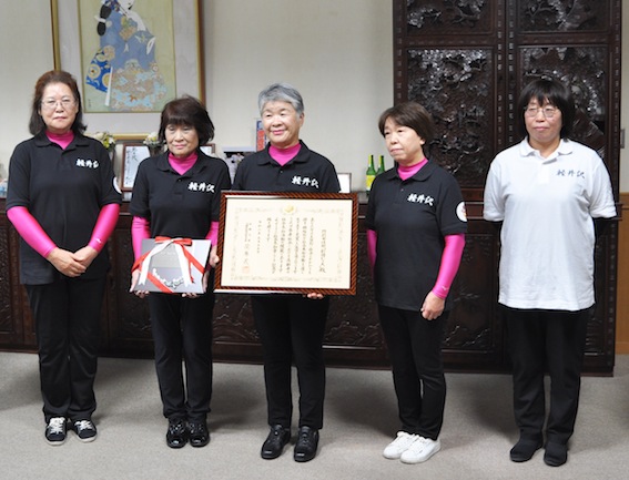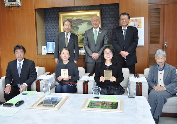 町長に宣言を手渡す、軽井沢別荘団体連合会の小林徹会長(左)。 軽井沢文化協会、軽井沢別荘団体連合