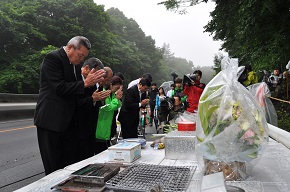 学生ら15人が亡くなったスキーツアーバス転落事故から半年を迎えた7月15日、献花台のある現場には