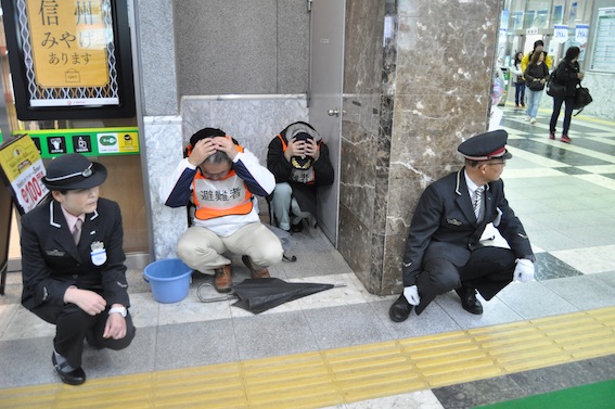 壁際に避難し、頭をおさえしゃがんだ姿勢をとる参加者。 弾道ミサイルが日本に向け発射された想定で、
