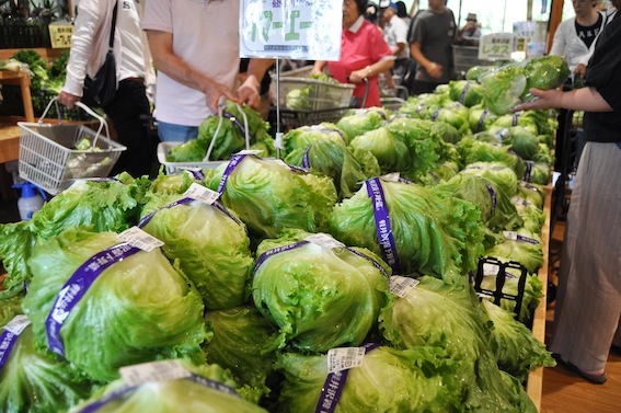 軽井沢発地市庭のレタス、キャベツ。午前中で売り切れることも多い。 軽井沢の今年7月の平均気温は、