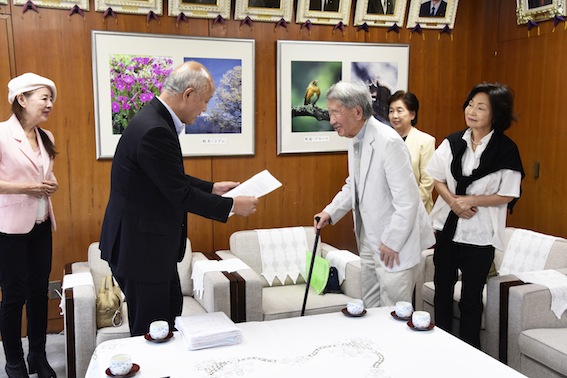 藤巻町長に署名を提出する羽仁進さん。 3年前に皆伐し、今も更地のままの田崎美術館前(9月30日撮影