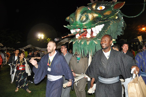 各国から集ったJC会員が、龍神太鼓に合わせ、龍を担いで歩いた。 日本青年会議所(JC)は7月5〜