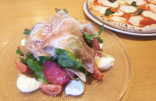 写真は「生ハムとモッツァレラブッファラ トマトのミックスサラダ」Lサイズ1320円、「マルゲリータ」1320円。(ディナーメニュー)