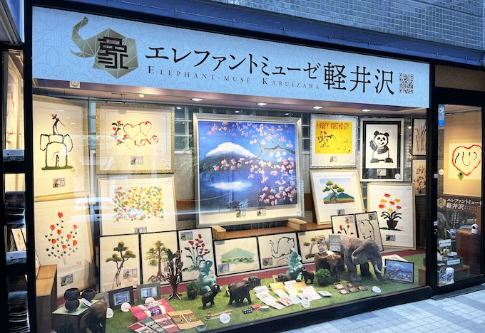タイのエレファント・キャンプの象が描いた絵を展示するギャラリー「エレファントミューゼ軽井沢」が5月初旬、旧ゴルフ通りにオープンした。ギャラリーは無人で、ガラス越しに約40点の作品を展示。富士山と桜を描いた150号の「桜富士」をはじめ、色彩豊かな花、パンダを描いた作品もある。象が鼻でつかんだ筆を器用に使い、キャンバスに色をのせていく映像も流している。