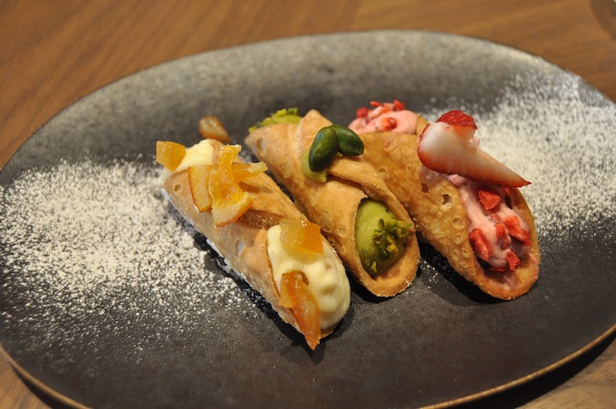 ホテルインディゴ軽井沢が4月からスタートした、午後のカフェタイム「インディゴ・メレンダタイム」。次に流行ると言われているシチリア島発祥の菓子「カンノーリ」とドリンクをセットで提供している。筒状に揚げた生地に、県内産牛乳や荻原養蜂園のアカシアはちみつで甘味とコクを出したリコッタチーズのクリームを詰めた。ピスタチオ、軽井沢いちごとフランボワーズ、オレンジの3種。「地元の食材を使い、見た目の鮮やかさを意識しました」と、考案者のベーカリーシェフ三海淳一さん。